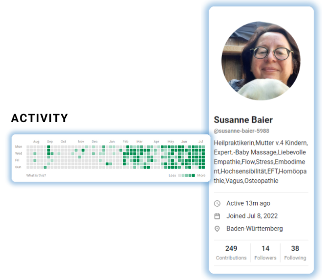 Heilpraktikerin Susanne vermittelt dir wertvolle Techniken und Impulse für mehr Energie, Entspannung und Lebensfreude. In einem sicheren und wertschätzenden Umfeld kannst du dich mit anderen Mitgliedern austauschen, neue Freundschaften knüpfen und von den Erfahrungen der Gemeinschaft profitieren.